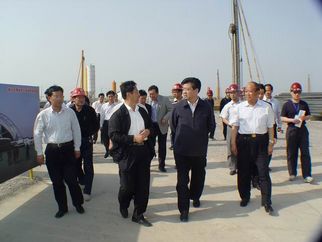 2008年5月5日下午,許立全市長視察建設(shè)中的奧體中心工程。董事長徐鵬強(qiáng)(上圖左一)陪同視察。 |