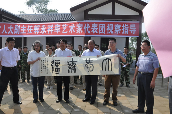 6月3日上午,四川省人大副主任郭永祥率藝術(shù)家代表團(tuán)赴北川新縣城慰問(wèn)援建士。藝術(shù)家們或現(xiàn)場(chǎng)作畫(huà),或引亢高歌,或與援川員工同臺(tái)表演,真誠(chéng)表達(dá)他們對(duì)山東人民援川的感激之情。集團(tuán)公司援川員工還為藝術(shù)家代表團(tuán)合唱《援川之歌》。慰問(wèn)演出前,郭永祥副主任還視察了集團(tuán)公司援建的安居房工程,藝術(shù)家們還實(shí)地參觀了新的安居房家居,看到漂亮、舒適的安居房,聽(tīng)著援川人的感人事跡,藝術(shù)家們表達(dá)了對(duì)援川將士的由衷贊嘆,并再一次代表北川縣的受災(zāi)同胞對(duì)山東的援建表示真誠(chéng)的謝意。 ![]() 圖為藝術(shù)家展示藝術(shù)作品