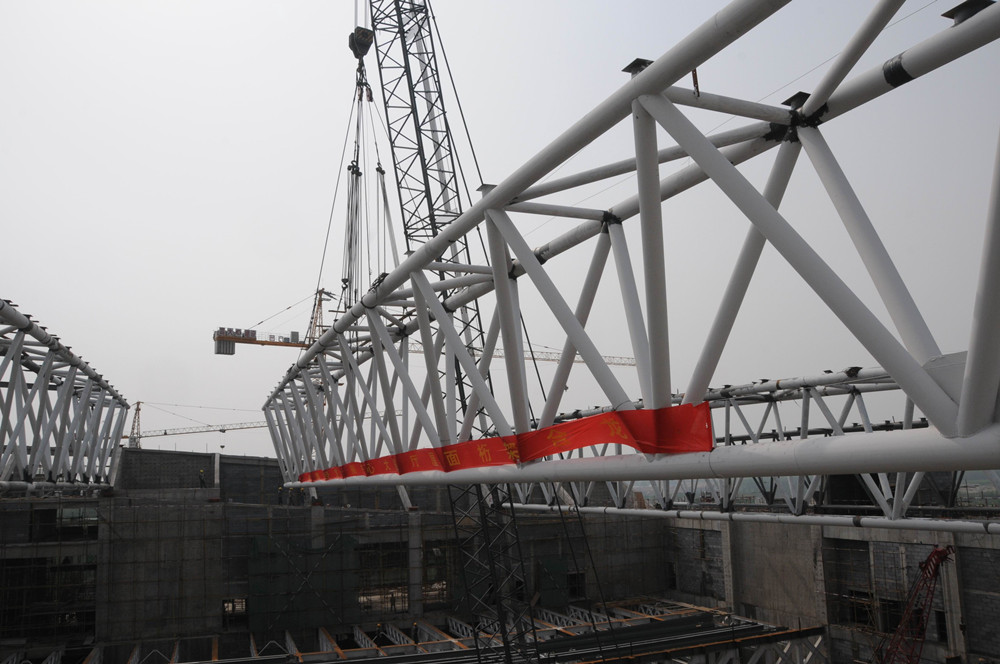 當(dāng)天下午2點(diǎn)38分,會(huì)展中心工程現(xiàn)場(chǎng)鞭炮齊鳴,伴隨著320噸大吊車的一陣轟鳴,最后一榀97噸重的鋼構(gòu)桁架徐徐升起、吊裝就位、校正扶位。集團(tuán)公司總經(jīng)理、會(huì)展中心工程總指揮朱九洲,會(huì)展中心工程現(xiàn)場(chǎng)總指揮孫孔喜,集團(tuán)公司副總工程師、會(huì)展中心質(zhì)量技術(shù)組組長(zhǎng)王維奇及集團(tuán)公司會(huì)展中心指揮部成員、參建單位項(xiàng)目經(jīng)理參加了吊裝儀式。