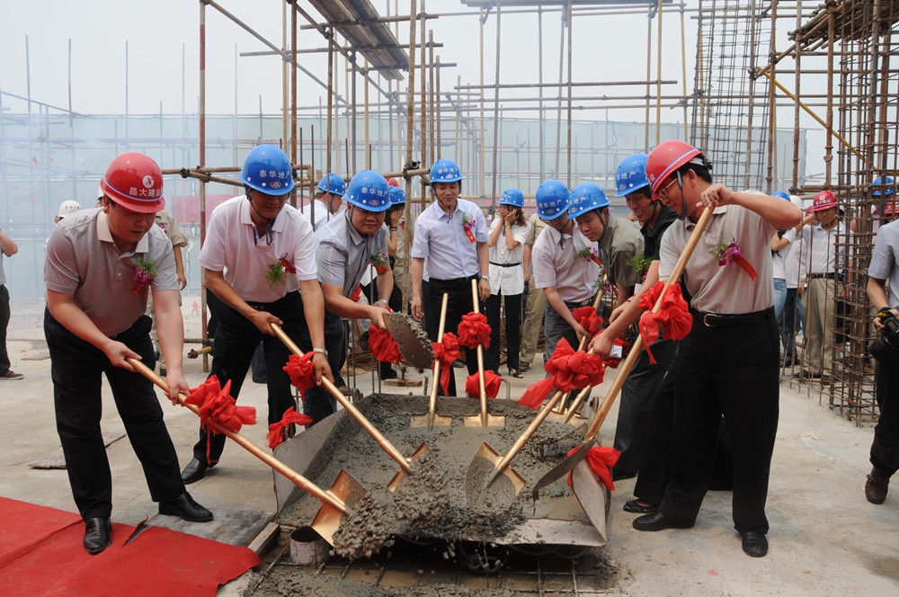 6月16日上午11時(shí)16分,由第二分公司承建的泰華城•榮觀華府工程舉行了主體封頂儀式。集團(tuán)公司董事長(zhǎng)徐鵬強(qiáng)、總經(jīng)理朱九洲,建設(shè)單位泰華集團(tuán)董事長(zhǎng)劉云江,監(jiān)理單位董事長(zhǎng)曹金彩等領(lǐng)導(dǎo)出席封頂儀式并為泰華城•榮觀華府工程裝填最后一車封頂砼。參加封頂儀式的還有來自建設(shè)單位、施工單位、監(jiān)理單位及參建單位的200多名代表。 泰華城•榮觀華府工程是濰坊市唯一的商業(yè)CBD項(xiàng)目,工程位于美麗的白浪河畔。本期項(xiàng)目總建筑面積216673平方米,工程基礎(chǔ)采用CFG復(fù)合地基,2m厚的筏板基礎(chǔ),地下三層和地下二層為車庫,地下一層至四層為商業(yè),五層至二十九層為公寓。工程采用流線型設(shè)計(jì),從空中看像游戈在白浪河中一條巨大的彩魚,從側(cè)面看像停泊在白浪河畔的一艘巨大的航母,1#東西塔樓像兩個(gè)巨大的風(fēng)帆。該工程自2010年4月15日筏板基礎(chǔ)圖紙出具以后正式開工建設(shè),第二分公司項(xiàng)目部組織人員搶工期,抓質(zhì)量,保形象,克服了施工現(xiàn)場(chǎng)狹小、工程結(jié)構(gòu)復(fù)雜、施工穿插組織難度大等各方面困難,歷時(shí)368天,以比原計(jì)劃工期提前26天的優(yōu)異成績(jī)封頂,同時(shí)實(shí)現(xiàn)優(yōu)質(zhì)、安全,贏得了建設(shè)單位和監(jiān)理單位的高度稱贊。該工程的提前順利封頂,為昌大和泰華兩個(gè)集團(tuán)公司以后的戰(zhàn)略合作夯實(shí)了基礎(chǔ),埋設(shè)了基石,譜寫了輝章。