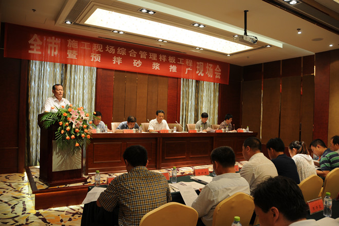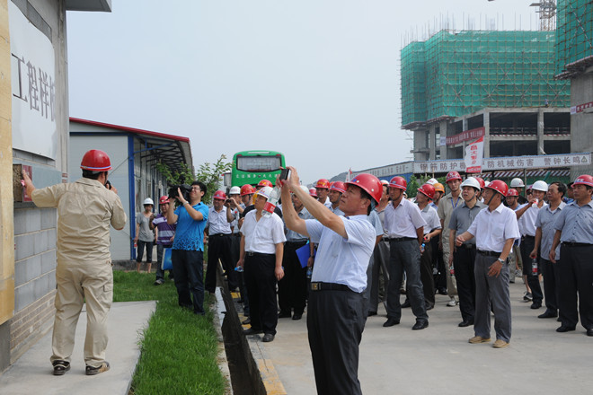 7月25日上午,由濰坊市建筑工程管理處組織的“全市施工現(xiàn)場綜合管理樣板工程暨預(yù)攪拌砂漿推廣現(xiàn)場會”在集團(tuán)公司第四分公司承建的金融廣場舉行。來自濰坊各縣市區(qū)、市屬開發(fā)區(qū)建工處(局)分管主任(局長)、有關(guān)科室負(fù)責(zé)人;全市房屋建筑施工總承包一級企業(yè)和部分二級企業(yè)分管經(jīng)理,部分預(yù)攪拌砂漿生產(chǎn)企業(yè)代表共計(jì)120余人參加了現(xiàn)場會。集團(tuán)公司總工程師張連悅出席現(xiàn)場會并做專題經(jīng)驗(yàn)介紹,集團(tuán)公司質(zhì)量技術(shù)部、生產(chǎn)安全部、資產(chǎn)管理部等有關(guān)部門相關(guān)人員參加了上午的現(xiàn)場會。