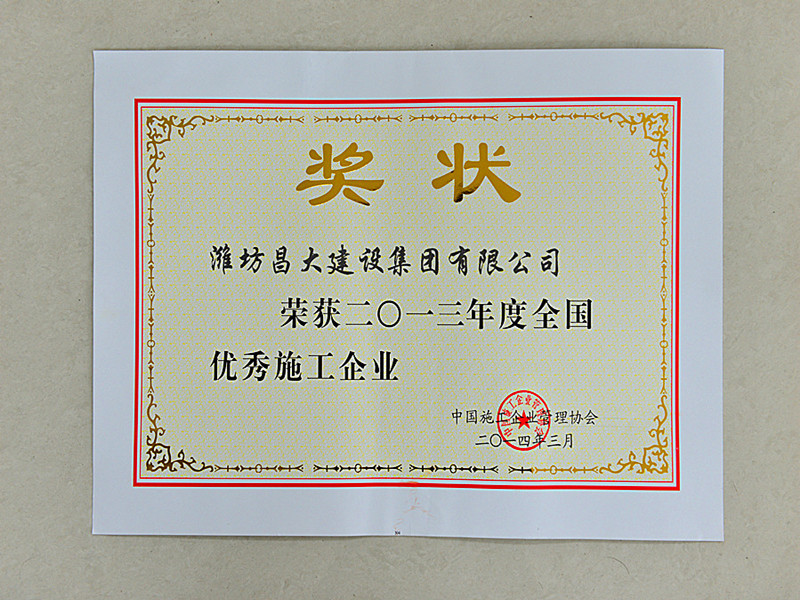 2014年4月18日,中國(guó)施工企業(yè)管理協(xié)會(huì)第29次年會(huì)暨2014年中國(guó)施工裝備展覽洽商會(huì)在南京召開(kāi)。會(huì)上,對(duì)2013年度全國(guó)優(yōu)秀施工企業(yè)進(jìn)行了表彰(人民日?qǐng)?bào)第24008期公示)。集團(tuán)公司榮獲2013年度全國(guó)優(yōu)秀施工企業(yè)稱號(hào)。