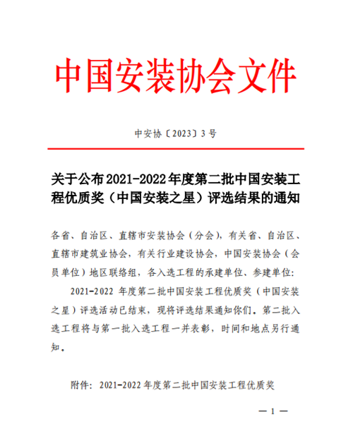 集團(tuán)公司再創(chuàng)一個(gè)國家級安裝工程質(zhì)量最高獎(jiǎng)——安裝之星