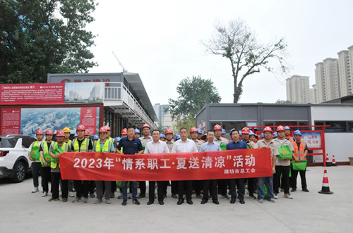 2023年7月12日上午,濰坊市總工會(huì)副主席朱建平到集團(tuán)總承包施工的市重點(diǎn)項(xiàng)目濰坊市人民醫(yī)院項(xiàng)目現(xiàn)場進(jìn)行了“情系職工?夏送清涼”走訪慰問活動(dòng),向廣大一線建設(shè)者表示慰問,并為一建公司、四建公司一線職工發(fā)放清涼物資包(天堂折疊傘、日照綠茶、六神花露水、奇強(qiáng)洗衣粉、舒蕾沐浴露、潔玉毛巾等)。