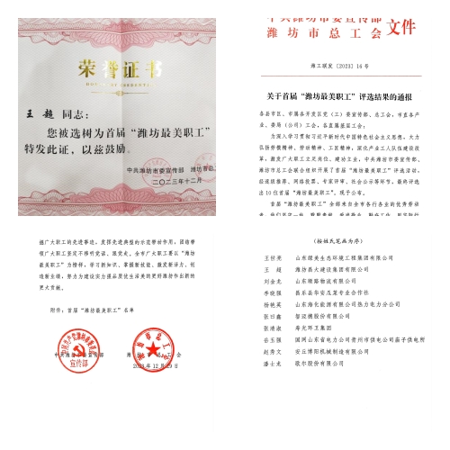 2024年1月19日上午,由市總工會舉辦的首屆“濰坊最美職工”頒獎儀式在濰坊市工人文化宮一樓西區(qū)104會議室隆重舉行。集團公司工會主席穆乃出席頒獎儀式。在首屆10名最美職工中,集團機施公司維修電工王超獲此殊榮。