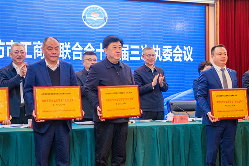 2024年3月22日上午,濰坊市工商聯(lián)十三屆三次執(zhí)委會在金茂國際大酒店召開。集團公司總裁朱九洲出席會議并作為濰坊民營企業(yè)家百名“敢創(chuàng)先鋒”代表上臺領獎。